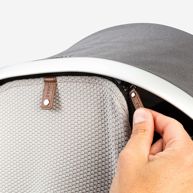 - С одной стороны крепится к капу на молнии (вместо козырька). С другой одевается на ручку коляски или на раму.