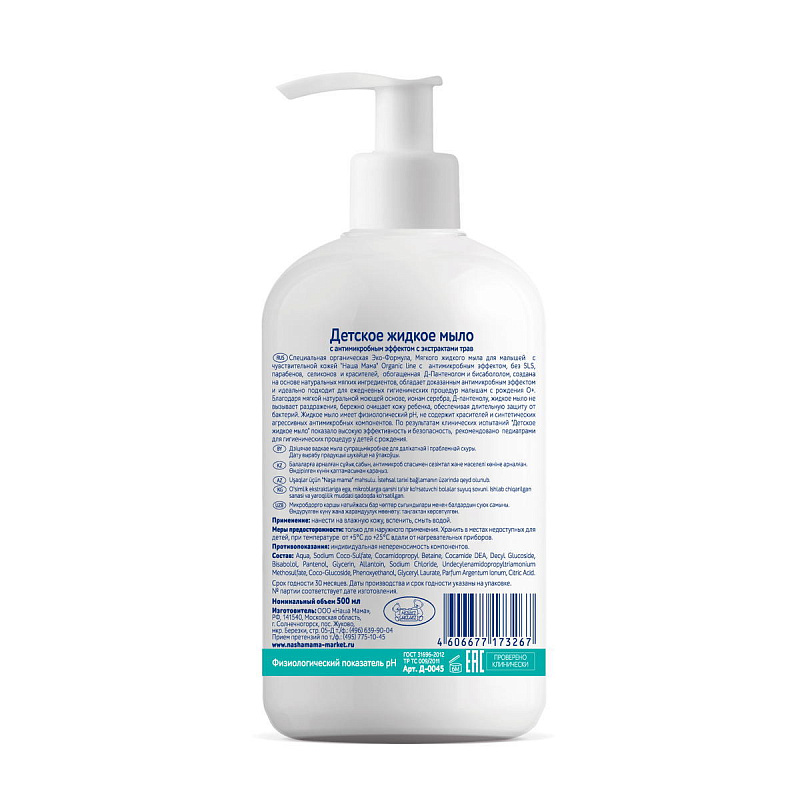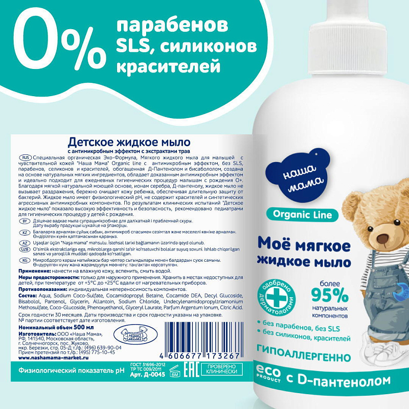 Жидкое мыло Наша мама Organic Line детское с антимикробным эффектом и экстрактами трав, 500 млНет оценокХарактеристики