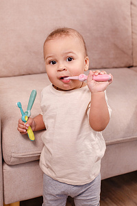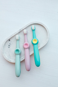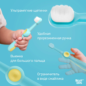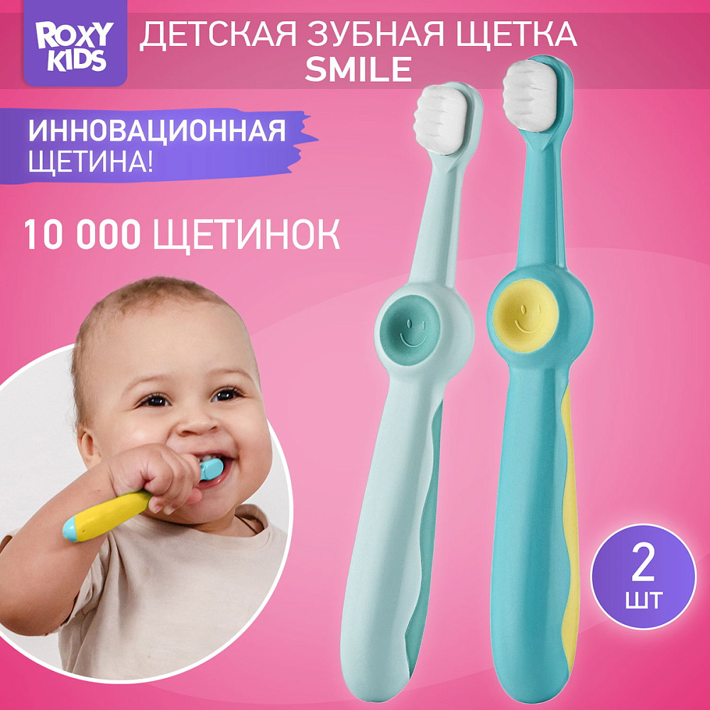 Зубные щетки SMILE от ROXY-KIDS с ультрамягкой щетиной предназначены для комфортного и безопасного ухода за первыми зубками и полостью рта малыша. Зубная щетка оснащена небольшой головкой и мягкой щетиной, которая бережно удаляет налет с детских зубов, а также аккуратно массирует десны. Прорезиненная ручка в виде смайлика веселит малыша и не будет скользить в руке, а большой палец удобно ложится в кружок со смайликом. Также смайлик выполняет функцию ограничителя, защищая малыша от заглатывания щетки.